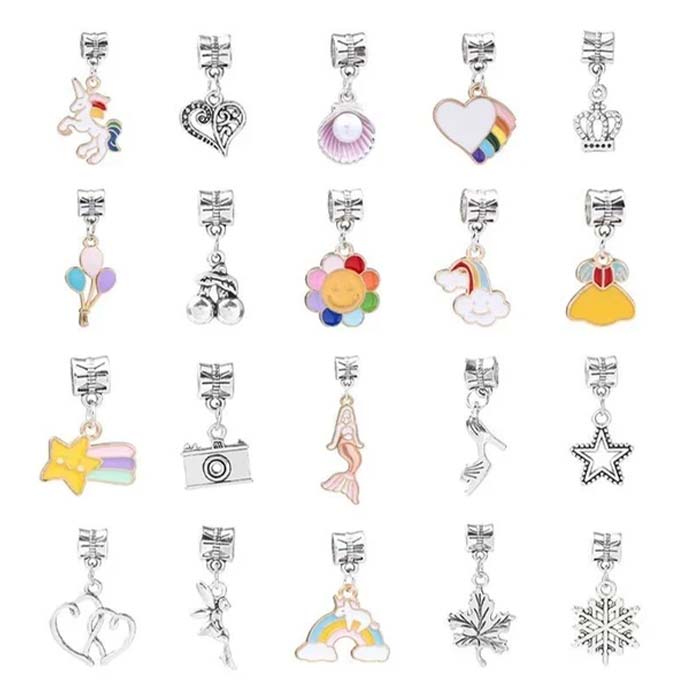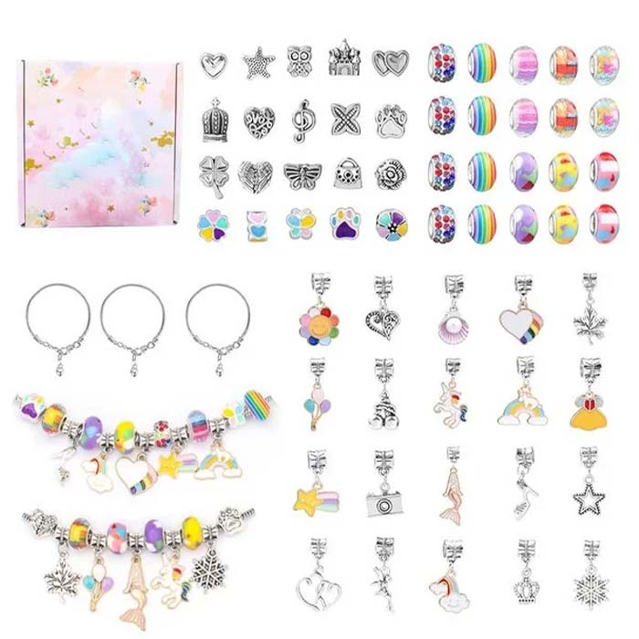 | V Paketu: | 6 x zapestnica, 40x pisana perlica, 40x okrasek za zapestnico različnih oblik, 40x pisan obesek različnih oblik, 2x darilna škatlica |