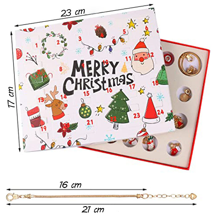 | Paket vsebuje: | 1x adventni koledar z 2 zapestnicama in 22 obeski s prazničnimi motivi + 1x adventni koledar z 2 zapestnicama in 22 obeski s prazničnimi motivi GRATIS |