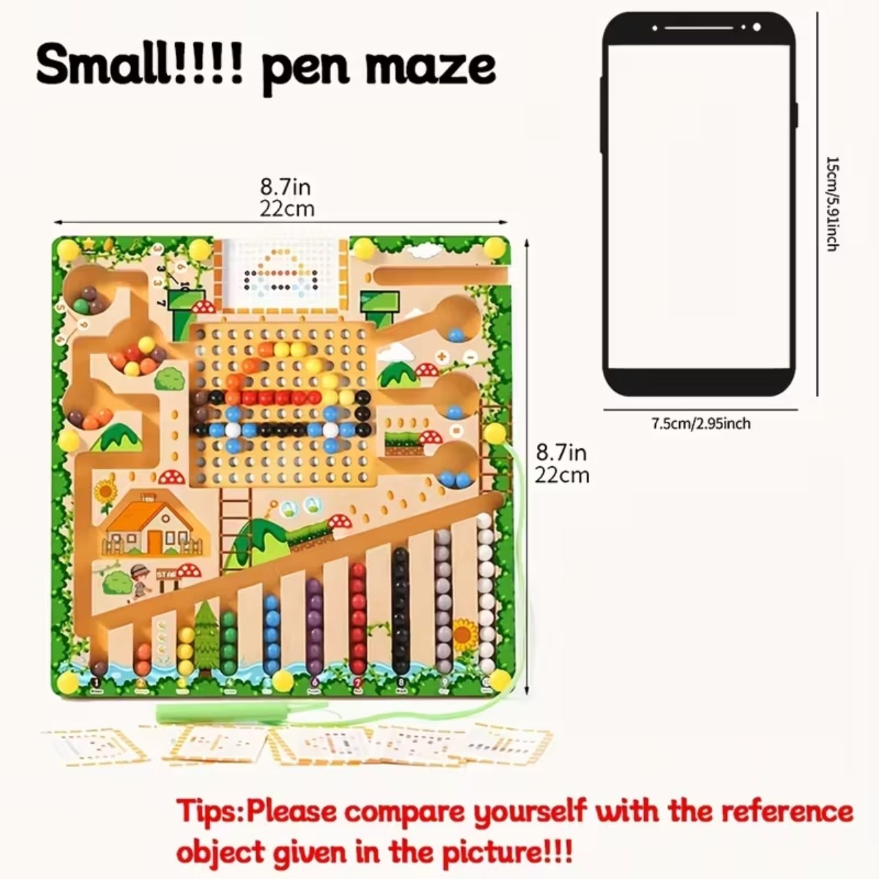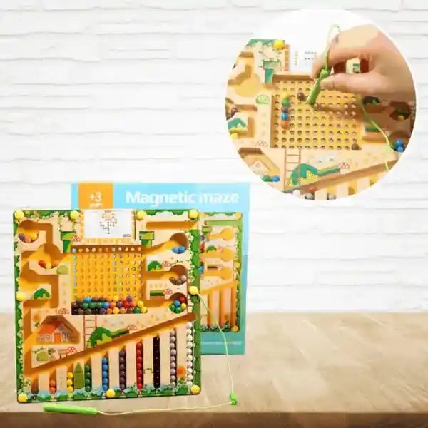 MazeGame spodbuja otrokovo radovednost, osredotočenost in potrpežljivost. S pomočjo svinčnika z magnetno konico otroci premikajo kroglice na pravo mesto in jih razvrščajo po barvah ali številkah. Z vsakim premikom se krepijo njihove miselne povezave in natančnost.