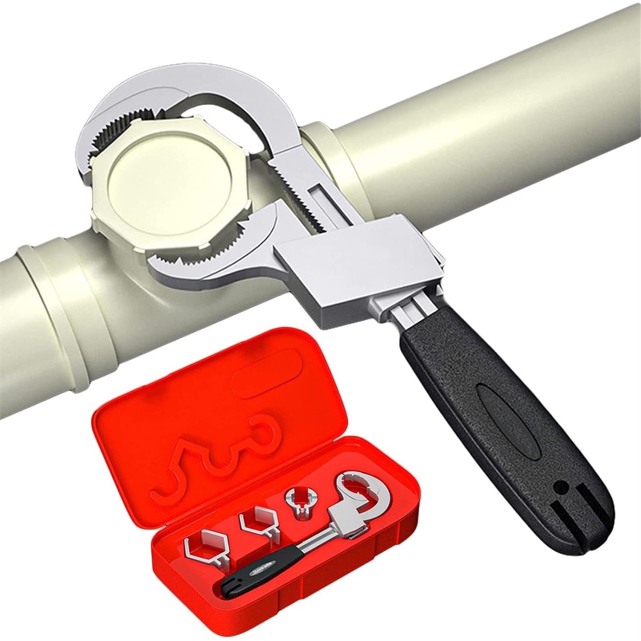 Univerzalno orodje za različne velikosti matic in vijakov. Izberite ustrezen nastavek glede na velikost cevi ali matice in ga namestite na glavo ključa. Ključ postavite okoli cevi ali spoja ter s pomočjo premične čeljusti prilagodite oprijem. Z obračanjem v smeri urinega kazalca zategnite spoj, za popuščanje pa obrnite v nasprotno smer. Orodje uporabljajte z enakomernim pritiskom in brez prekomerne sile. Po končanem delu sprostite čeljust, previdno odstranite ključ.